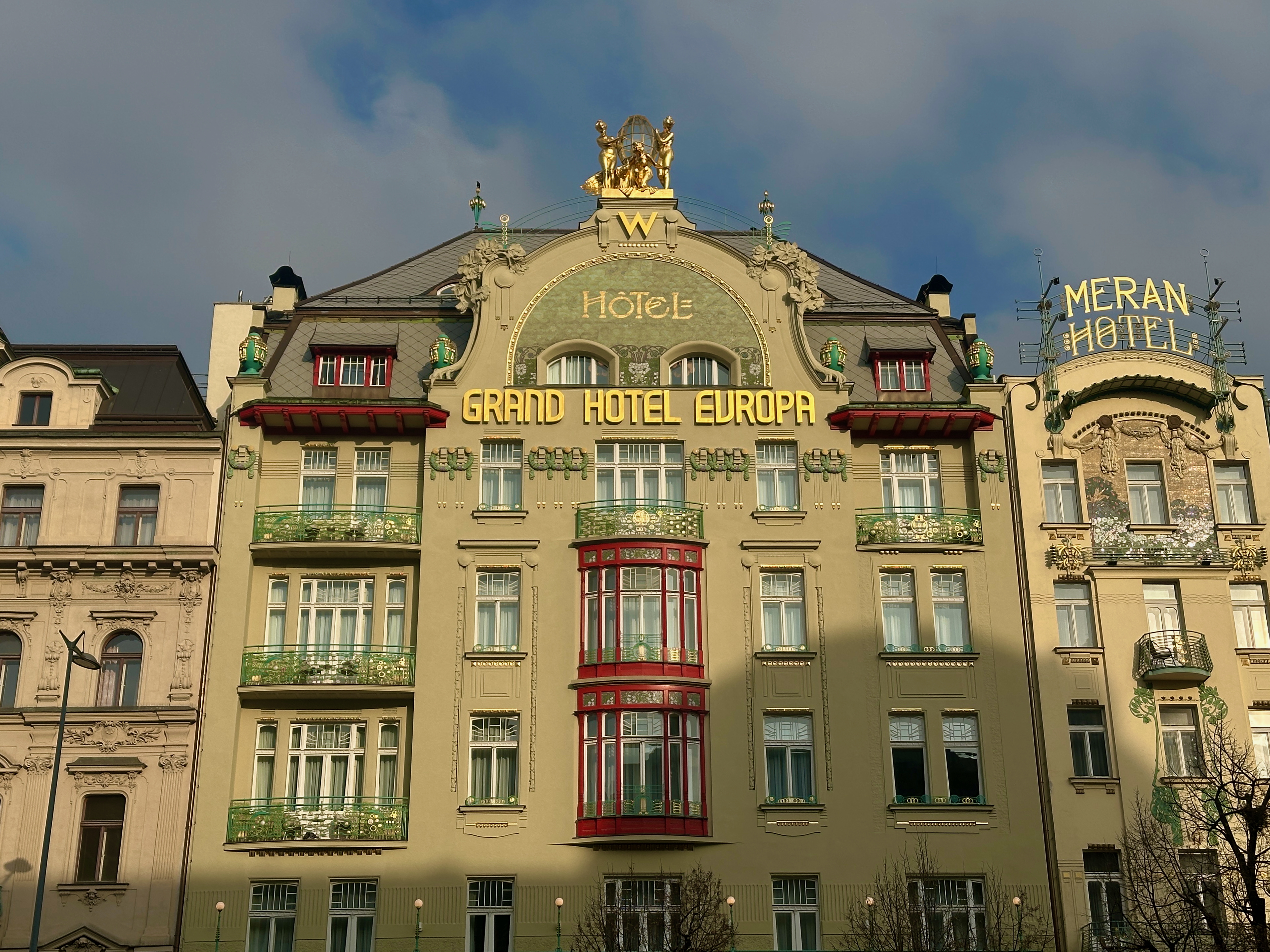 Ever since I first came to Prague in the 1980s, I’ve been fascinated by the Hotel Evropa. Part of the appeal was the hotel’s striking Art Nouveau exterior (and the plush interior of its street-level café). Though the building is not particularly large, its lyrical, rounded façade and signature design details always stood out on a square where the mix of grand architectural styles tend to compete with each other and cancel each other out. A few years ago, I tried to sort out the square’s architectural mish-mash in a post called “Understanding Wenceslas Square.”