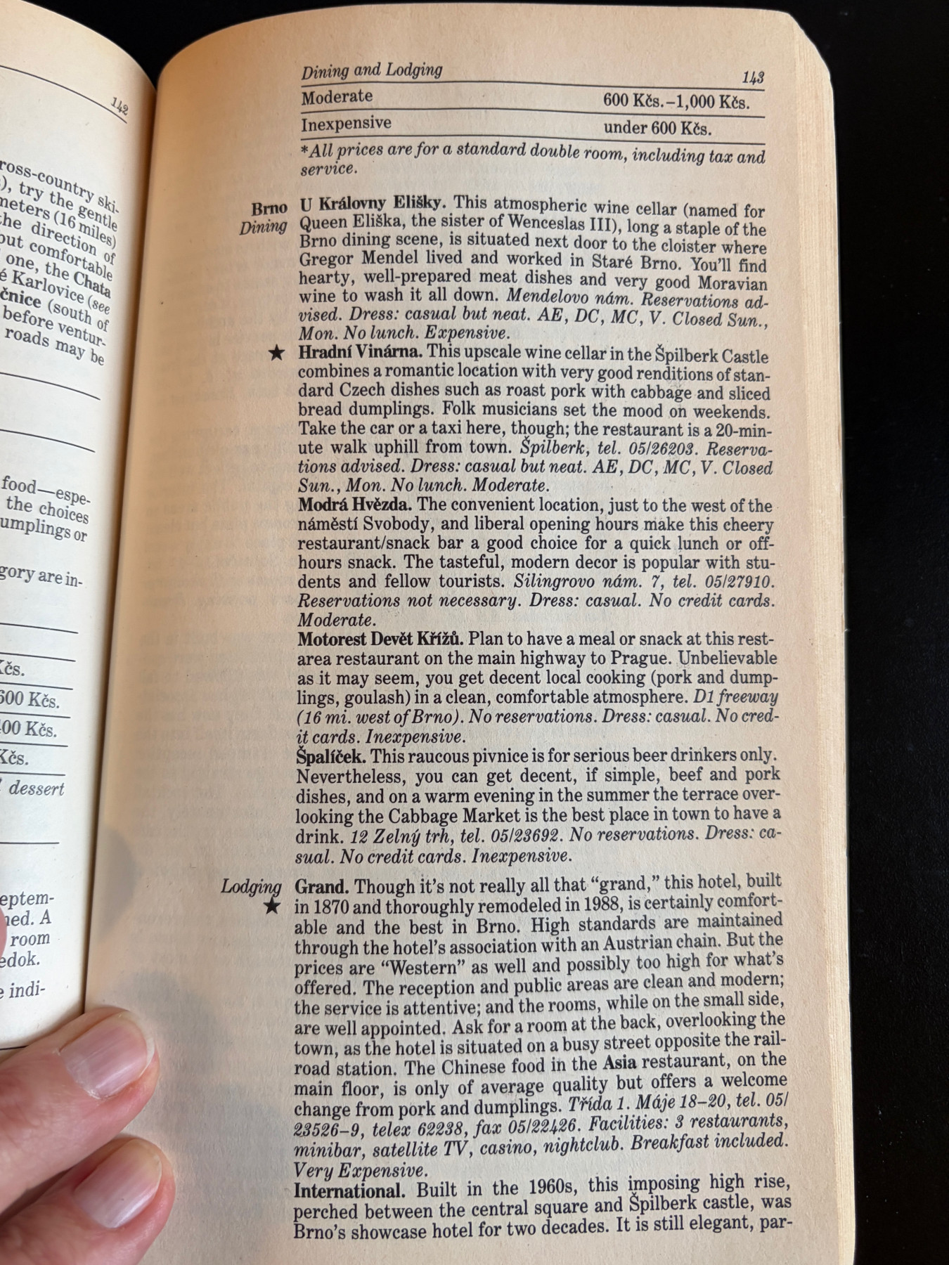 This was years before Brno cleaned up its streets, opened up some new museums and showcased its stunning heritage of interwar, modern architecture, including Ludwig Mies van der Rohe’s landmark “Vila Tugendhat” (the Tugendhat at the time was used to house guests of the city of Brno and closed to the public). Once tourists had seen Brno’s historic and quirky Gothic town hall, paid their respects to the pioneer of modern genetics, Gregor Mendel, who lived and worked here, and climbed to the top of grim Spielberg (Špilberk) Castle, there wasn’t much else to do. In the end, we presented Brno as a living museum of 18th-and 19th-century industrialization – the “Manchester of Moravia” – and invited readers to take in the surviving examples of Empire and neoclassical architecture.