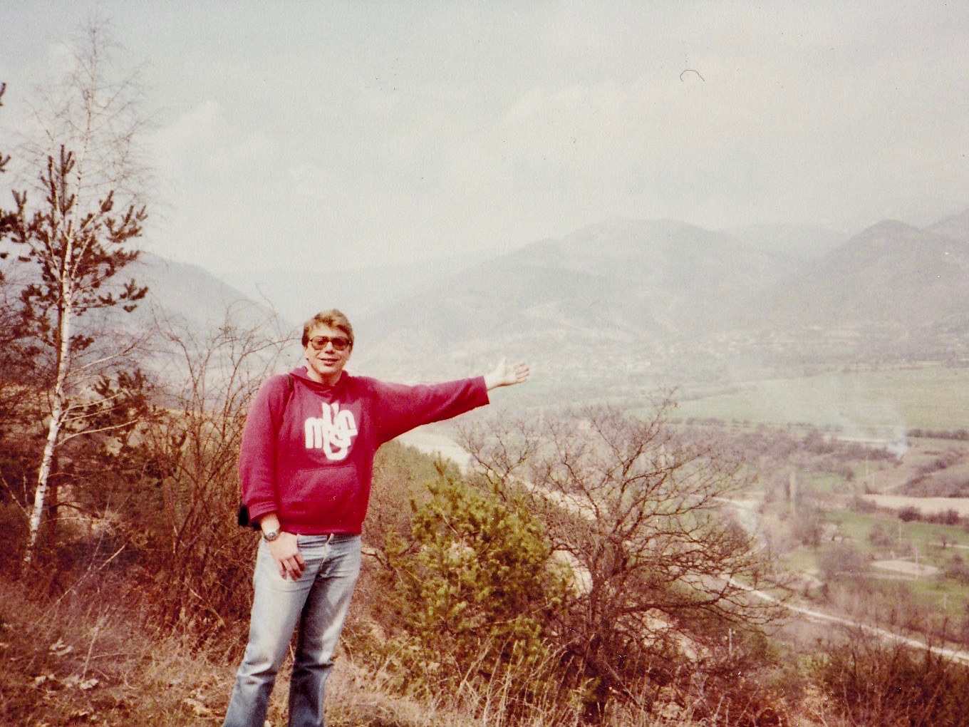 One of the great, underrated road trips of any era is along the highway that runs from Burgas to Sofia, passing south of Bulgaria’s central Stara Planina mountain range and through parts of the Valley of the Roses. We were bowled over by the scenery and stopped for breaks often. The photo at the top of this post shows Doug standing somewhere in the middle of Bulgaria and pointing into that pretty distance.