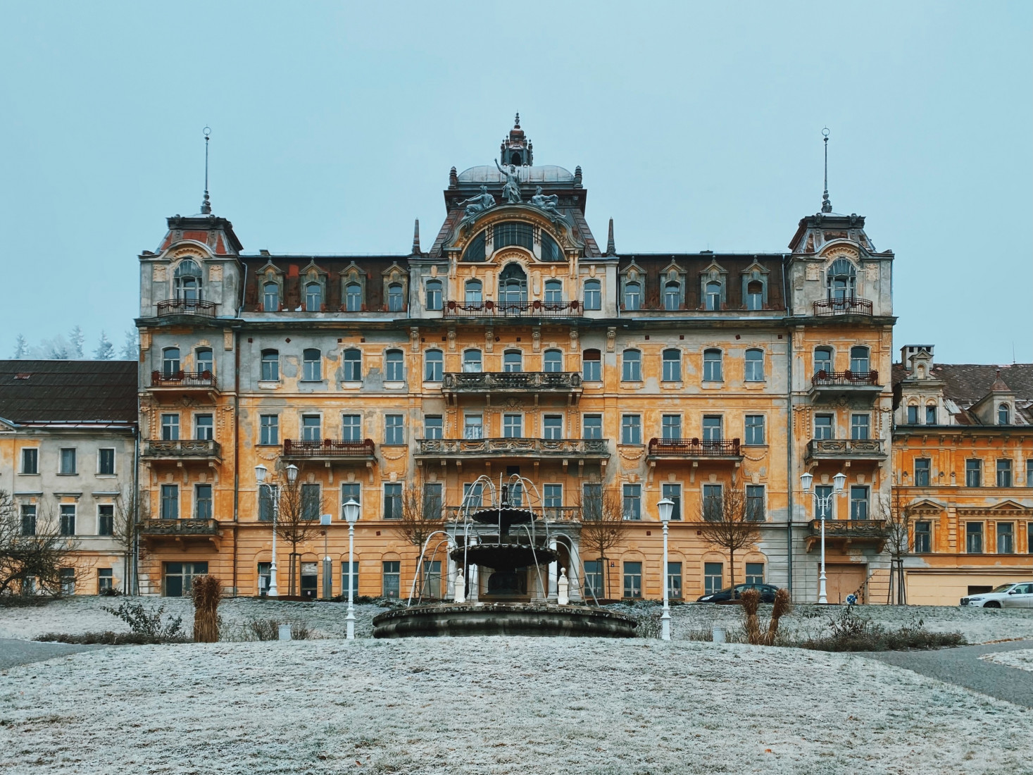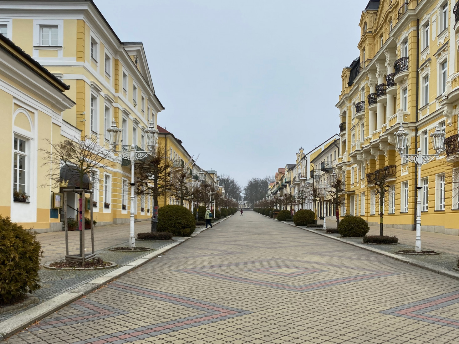 From Karlovy Vary, we took day trips to nearby Mariánské Lázně and Františkovy Lázně. In mid-February, both felt badly depopulated, but Mariánské Lázně’s spacious, wooded setting appeared more suited than built-up Karlovy Vary to how I had imagined a real spa might look. I was especially taken with the enormous “Weimar” hotel – incongruously called the “Kavkaz” (Caucasus) on our visit, as if it stood somewhere on the banks of the Caspian Sea. The grand Empire-style edifice, at least as big as a city block, had been a favorite of England’s King Edward VII at the turn of the 20th century. On our visit, the hotel was struggling to attract guests. On a more recent trip to Mariánské Lázně, in 2020, I noticed the hotel had sadly closed and stood abandoned. Tiny Františkovy Lázně was even quieter, though we appreciated the soothing yellow façades of the town’s main buildings. We chalked up the all-pervasive feeling of calm to a lack of any stimulus in the place whatsoever.